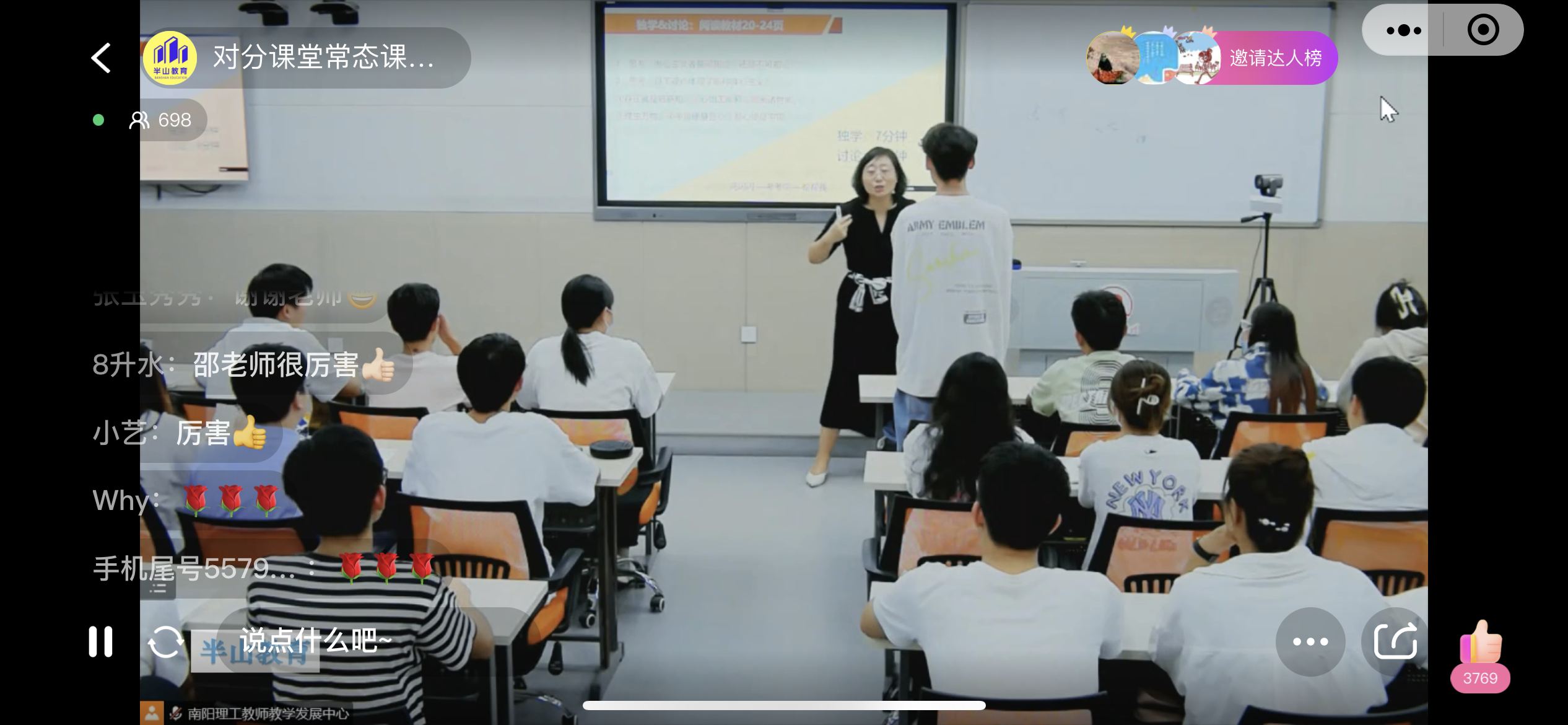 播出过程中,教师各具风采,课程各具特色,收看人数达到7千余人次,并且受到各界在线观看教师的一致好评。向全国教师直播自己的课堂,在国内高校尚属首次,我校对分课堂教师发展师常态课六期公益直播,不仅是我校教育教学改革的集中体现,也是向二十大的献礼。