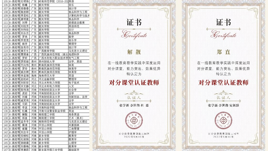 近日,我校对分课堂金牌教师发展师代表:外国语学院解靓老师和数字媒体与艺术设计学院郑直老师在教师节当日获得第一批“对分课堂认证教师”资格,该资格由对分课堂教育创新共同体设立的评审委员会认定。