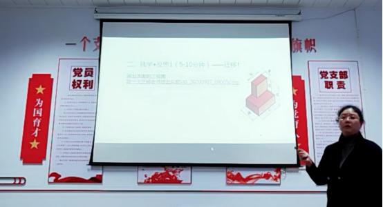 包金珠老师分享了她在本学期《工程制图与识图》这门课上实践对分的具体案例,首先分析学情,之后进行25—30分钟的精讲,5—10分钟的独学和反思,5—10分钟的小组讨论,最后是1分钟的全班交流、总结。她的实践心得是:过去传统讲授法教学课程中大量的专业名词讲述非常费力,基础薄弱学生都不容易听懂,就变得急躁或干脆弃学,作业正确率很低,通过对分课堂的教学,实现把枯燥的学科变得生动易懂起来,同学们接受能力大大提高,参与学习的积极性空前高涨,讨论环节积极性、参与度极高,作业正确率也出乎意料大幅度提高。本次课程还是第一次使用对分教学,在以后的教学中还会继续探索把对分教学进行到底,让我们的同学学有所得、积极向上、快乐轻松学习!